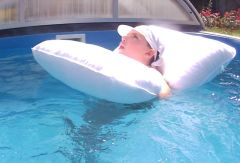 A nagyobb háttámlás úszópárna kialakítása sokat segített abban, hogy amikor már légcsőkanülje lett a gyermeknek, ekkor is tud úgy vízben lenni, hogy ne érje a nyakát a víz.