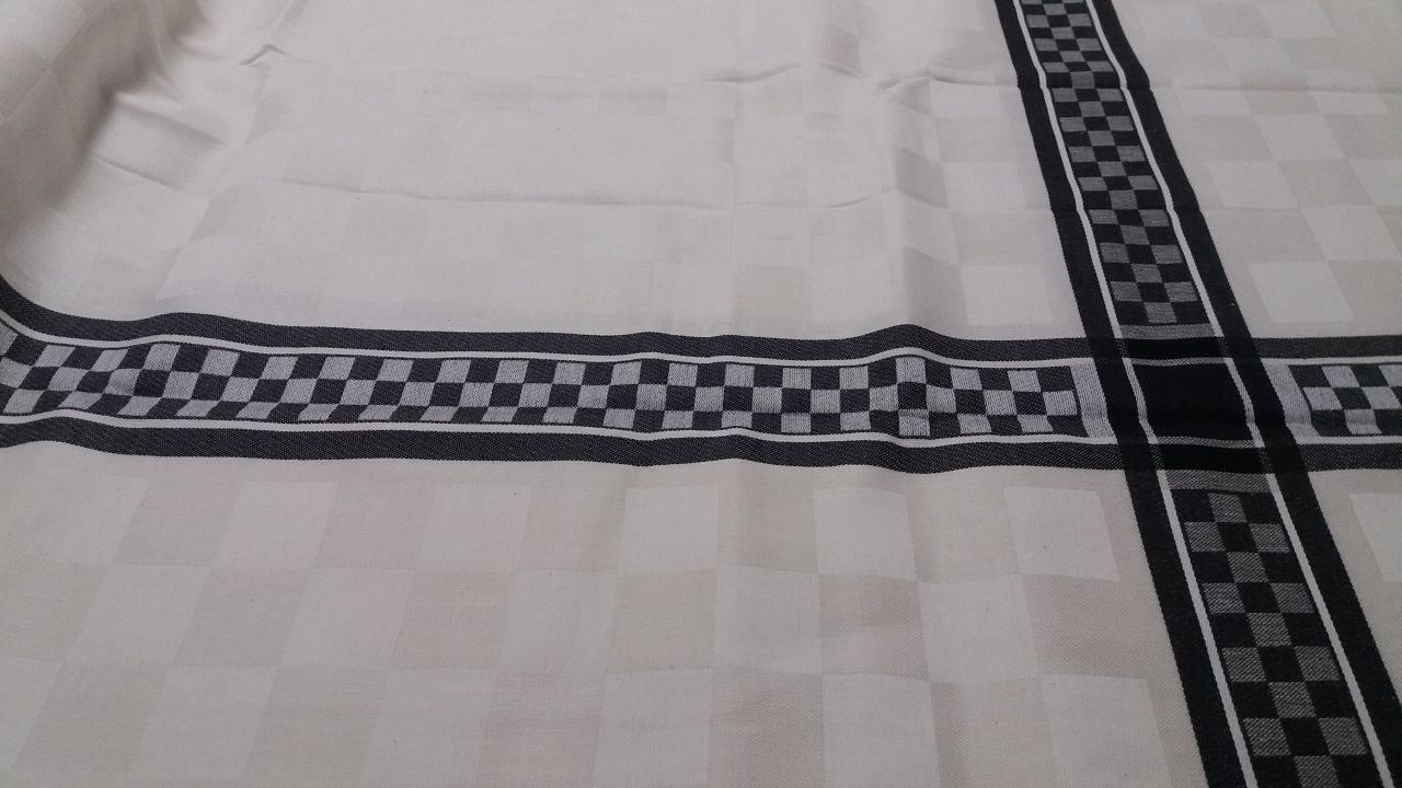50% pamut + 50% len tartalmú damaszt terítő.